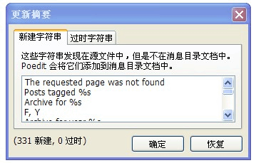 工程信息可以随便填,路径添加一个点 . 即可,关键字添加 _e 和 __ 即可,注意 __ 是两个半角下划线。设置好后确定,会弹出保存窗口,命名为zh_CN.po,保存到主题目录下即可,保存成功会弹出以下窗口,说明Poedit已经探测到这么多要翻译的英文了,确定即可。如果该窗口没有任何内容,说明该主题不支持Poedit翻译,请看方法二: